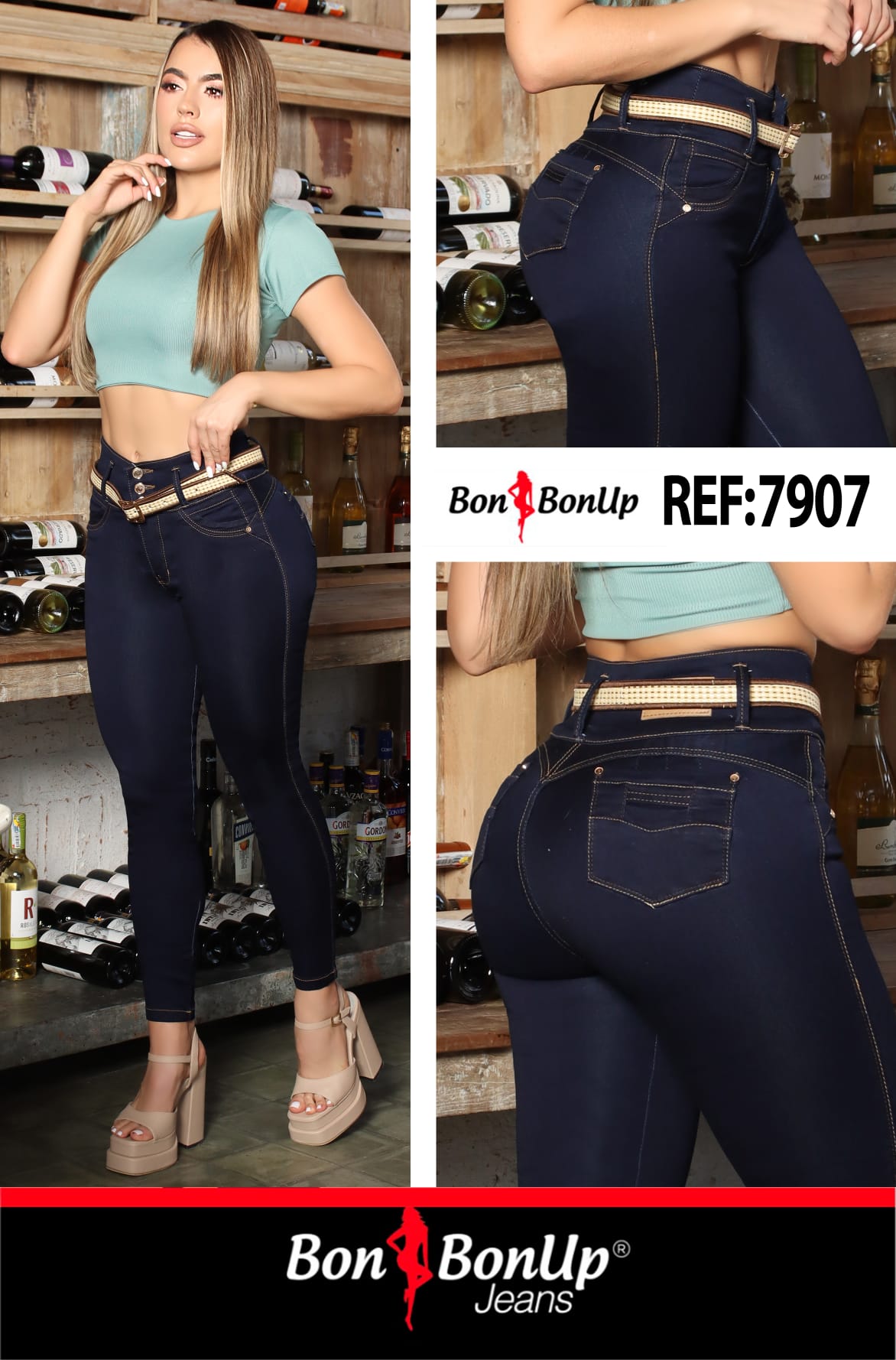 Indigo Skies, a testament to contemporary sophistication. These jeans boast a rich, deep indigo wash, designed to offer timeless versatility and a sleek aesthetic. The precision-cut, high-waisted design elongates the leg while gracefully contouring the figure, complemented by the artfully integrated multi-button closure and unique belt structure. Woven with a luxurious stretch blend, they provide a supremely comfortable and polished look, seamlessly transitioning from casual chic to elevated evening wear.